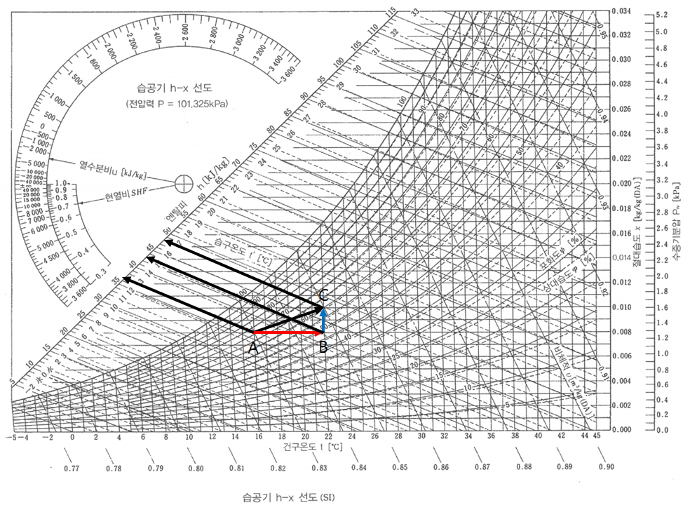 왜냐하면 엔탈피의 변화가 변화한 열량이기 때문이다. 따라서 이동한 두 지점의 엔탈피의 차이에 유량을 곱한 값이 실내 부하가 될 것이다. 여기서 선분 AC를 선분 AB와 선분 BC로 분해할 수 있다. 선분 AB는 온도선에 평행하고 선분 BC는 절대습도선에 평행하다.