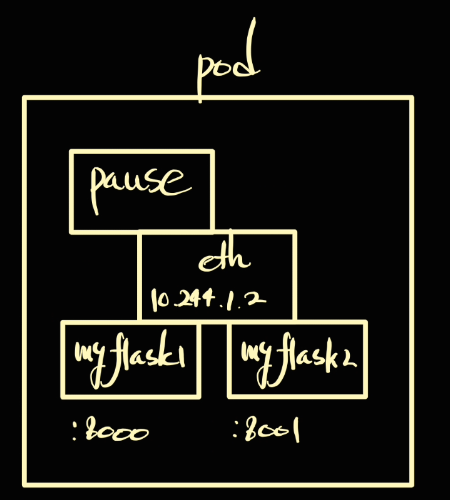docker 컨테이너는 서로 다른 인터페이스를 사용했는데 왜 pod의 컨테이너는 같은 인터페이스를 사용할까요? 이 이유는 pod가 생성될 때 제일 먼저 생성되는 컨테이너로 pause라는 컨테이너가 뜨고 pod의 인프라를 담당해 주기 때문입니다. 이 컨테이너는 pod 내부의 컨테이너에게 network namespace을 공유합니다. 그렇기에 pod 내부의 컨테이너는 같은 네트워크 인터페이스를 사용하여 통신하게 됩니다. 심지어 컨테이너 내부에서 localhost로 다른 컨테이너에 접근할 수 있습니다.