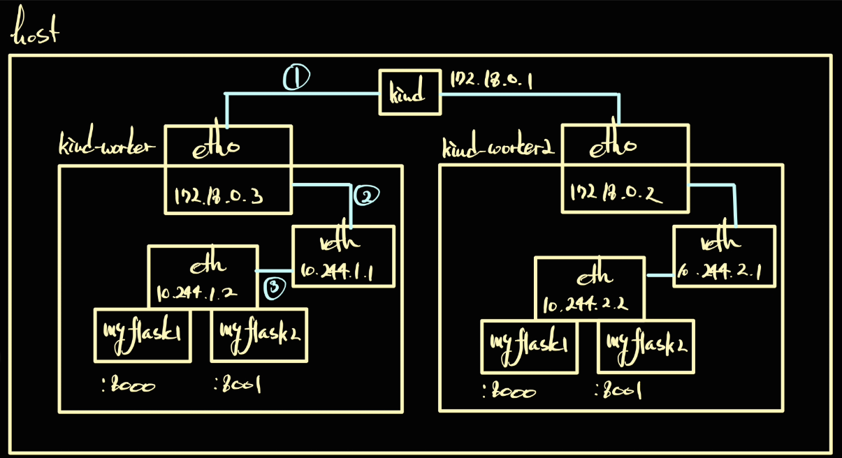 그러면 node에서 임의의 pod에 띄워져 있는 컨테이너에 트래픽을 전달했을 때 응답을 받는 것은 당연해 보입니다. 마찬가지로 pod 내부의 컨테이너에서도 가능할 것 같습니다. 한번 kind-worker위에 올라가 있는 myflask1 컨테이너에서도 다른 컨테이너 주소로 트래픽을 보내봅시다. 먼저 다음 명령어로 접속할 수 있습니다.